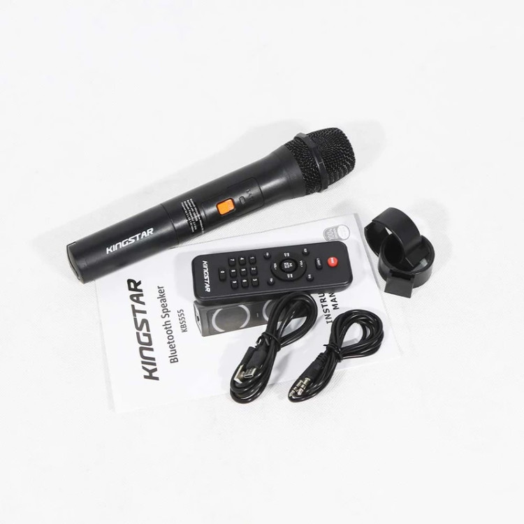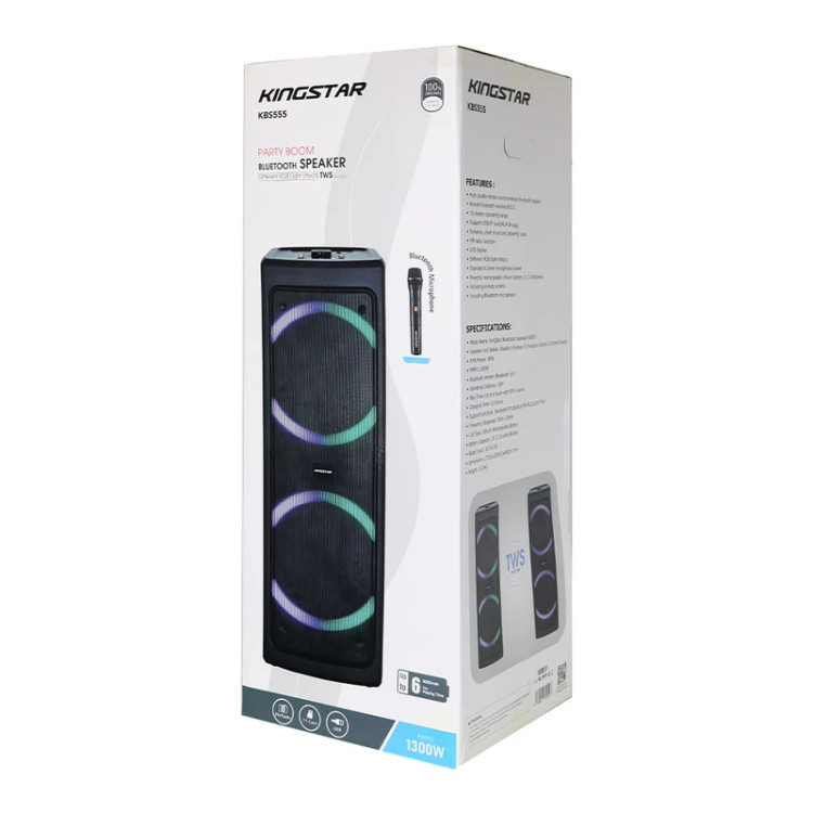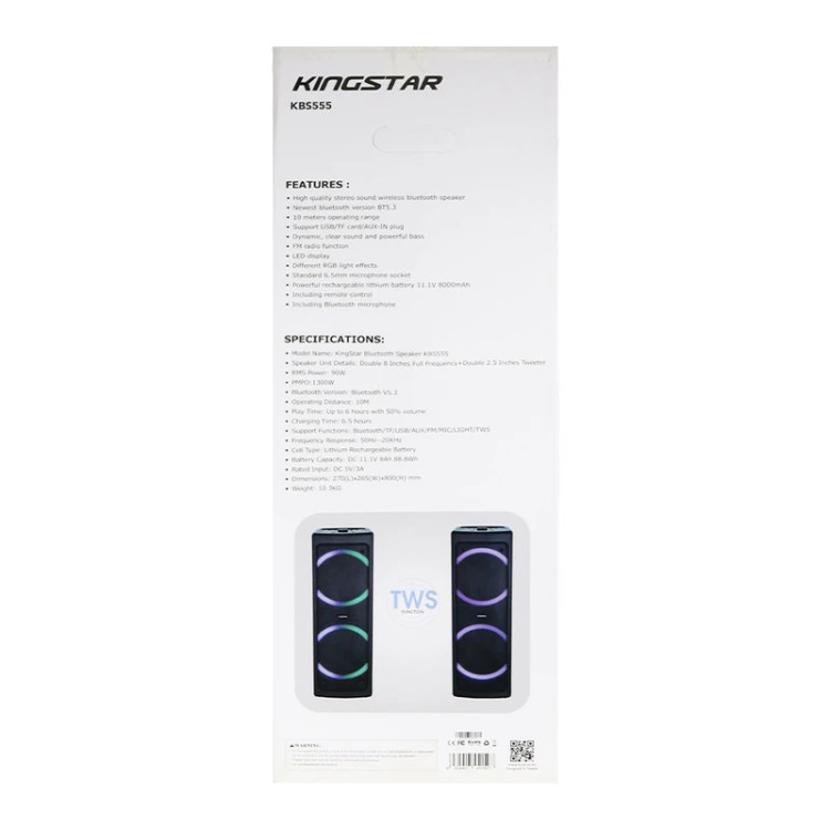 اسپیکر بلوتوثی کینگ استار مدل KBS555 از جدیدترین محصولات پرقدرت و پرطرفدار برند کینگ استار است. این هیولای دوست داشتنی، با بیس قوی، تجربهای هیجان انگیز از لذت شنیدن موسیقی را به شما ارائه میدهداز مهمترین ویژگیهای اسپیکر کینگ استار مدل KBS555 میتوان به سایز 2 درایور 8 اینچی به همراه 2 توییتر 2.5 اینچی اشاره کرد. همچنین دارای توان خروجی بالای 90 وات و توان لحظهای 1300 وات است. یکی دیگر از ویژگیهای مورد پسند این محصول، مربوط به نورپردازی آن است که دارای طیفهای رنگی متنوعی است. مورد دیگری که میتوان بعنوان ویژگی پرطرفدار به آن اشاره کرد، قابلیت پشتیانی از AUX، فلش مموری، کارت حافظه به همراه قابلیت اتصال به رادیو است. باتری این اسپیکر همچنین از نوع لیتیوم قابل شارژ با ظرفیت 11.1 ولت 8000 میلی آمپر ساعت است. علاوه بر موارد گفته شده در ارتباط با طراحی و کارایی این مدل، باید به مدت زمان استفاده از آن نیز اشاره نمود که حدود 6 ساعت با میزان صدای 50% را پشتیبانی میکند. علاوه بر آن مدت زمان شارژ این کالا حدود 6.5 ساعت خواهد بود. همچنین اسپیکر KBS555 با ابعاد 270*265*800 میلیمتر و وزن 10.03 کیلوگرم مناسب برگزاری مهمانی و دورهمی نیز خواهد بود. بازه فرکانس این محصول بین 50 هرتز الی 20 کیلوهرتز است.فناوری True Wireless Stereo یا به اختصار TWS یک راه ارتباطی بر پایه فناوری بلوتوث است که امکان برقراری اتصال بدون سیم دو دستگاه همنام را فراهم کرده است و از آن طریق میتوان صدایی Stereo با دو کانال صوتی چپ و راست را پخش کرد