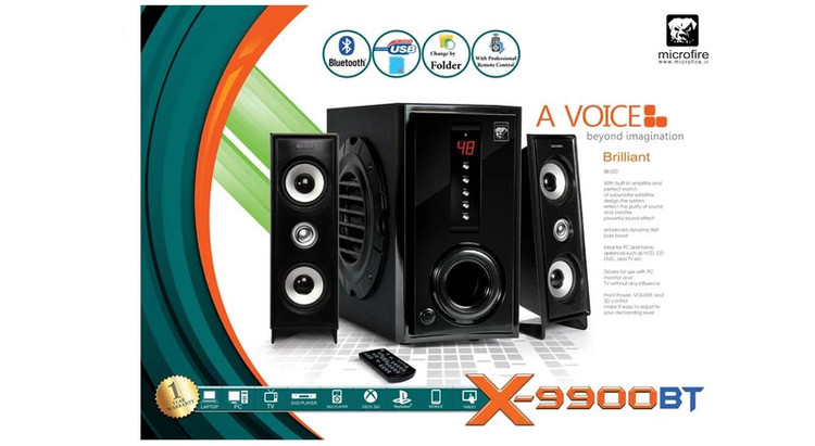 اسپیکر ۹۹۰۰ میکروفایر (از سری ۹۰۰۰ اسپیکرهای دو به یک برند میکروفایر ) محصولی است از شرکت فن آوران دشت شیر افلاک ؛ پرسابقه ترین سازنده انواع بلندگو در ایران این اسپیکر شامل دو بلندگو و یک ساب ووفر میباشد بلندگوها با کابل متصل به پشت بدنه به ساب ووفر متصل میشوند و به سه روش :اتصال با کابل دو به یک (موجود در درون پک اسپیکر ) ،درگاه usb روی بدنه دستگاه و یا به صورت بلوتوث میتوانند به تمامی دستگاه های پخش کننده صدا و موسیقی شامل کامپیوتر ، لپ تاپ ، DVD Player ، MP3 Player ،تلویزیون ، گوشی های هوشمند و... متصل شوند و بلندی و کیفیت صدا بی نظیری برای شنونده به همراه داشته باشند .این اسپیکر دارای یک عددفول ریموت کنترل درون پک اسپیکر برای راحتی کار می باشد. این اسپیکر در یک بسته بندی زیبا و طراحی و کیفیت فوق العاده و صدای شفاف و قوی ارائه میگردد .توان خروجی هر یک از بلندگوهای این اسپیکر 20 وات (8 اهم , "3 , 4*10w) و توان خروجی ساب ووفر آن 25 وات (4 اهم , "5.25) است و توان خروجی کل اسپیکر 65 وات واقعی می باشد.